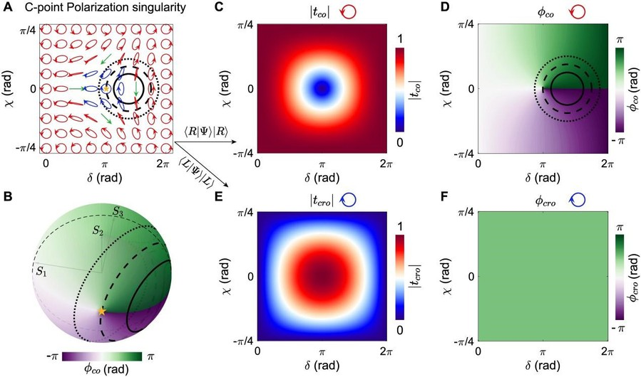 To break through this technical bottleneck, Professor Zhang's team proposed for the first time that the spin-dependent phase mechanism of circularly polarized waves originates from singularities on the Poincaré sphere, termed the co-polarization singularity phase. By optimizing the intrinsic parameters of the unit cells to make them encircle the singularity along the path of maximum amplitude, the team achieved topologically stable 2π phase coverage with high efficiency. Furthermore, by combining this with the dynamic phase, the team successfully demonstrated efficient wavefront multiplexing for the circularly polarized co-polarization channel .
