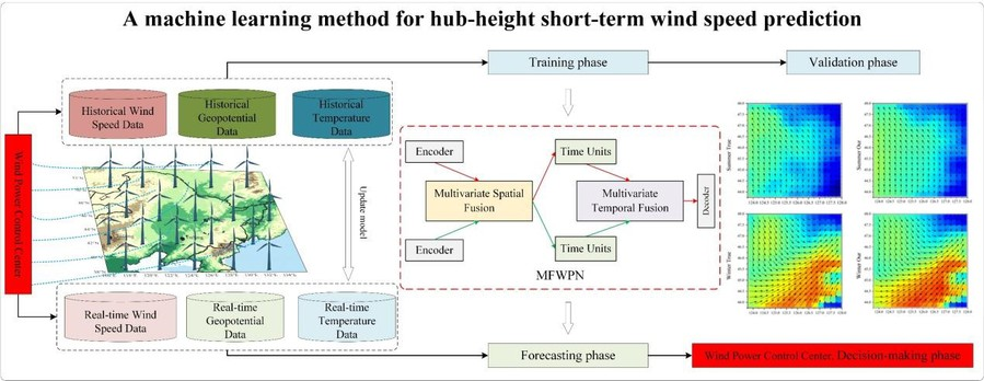 To address these challenges, Professor Lin's team proposed the MFWPN to achieve a new method for fine-grid vector wind speed prediction. The study employs a CNN-Transformer architecture to extract spatiotemporal features of wind speed and uses a spatiotemporal fusion module to integrate multivariate meteorological information. Results demonstrate that within the first 6 hours, the MFWPN outperforms the European Centre for Medium-Range Weather Forecasts model in vector wind speed prediction accuracy. Transfer experiments confirm the model's strong generalization capability, enabling rapid application to wind speed prediction in different regions. Efficiency tests show that the MFWPN requires only 18 milliseconds to predict 24-hour fine-grid vector wind speeds in Northeast China. With its accuracy and efficiency, the MFWPN can serve as an effective tool for vector wind speed prediction, supporting ultra-short-term and short-term deployment planning for wind power centers and providing robust support for route planning of low-altitude aircraft .
