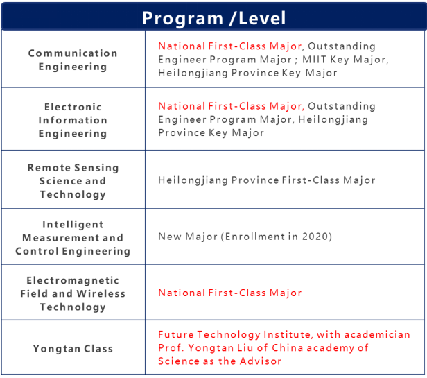Currently, the college has one first-level discipline (Information and Communication Engineering), one second-level discipline (Electromagnetic Field and Microwave Technology), six undergraduate programs (Communication Engineering, Electronic Information Engineering, Information Countermeasure Technology, Remote Sensing Science and Technology, Electromagnetic Field and Wireless Technology, Intelligent Measurement and Control Engineering), and one new minor program (Intelligent Information Engineering).