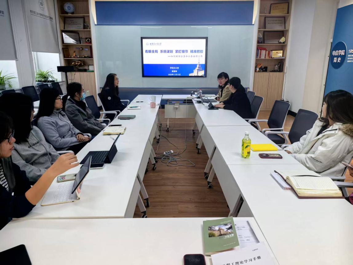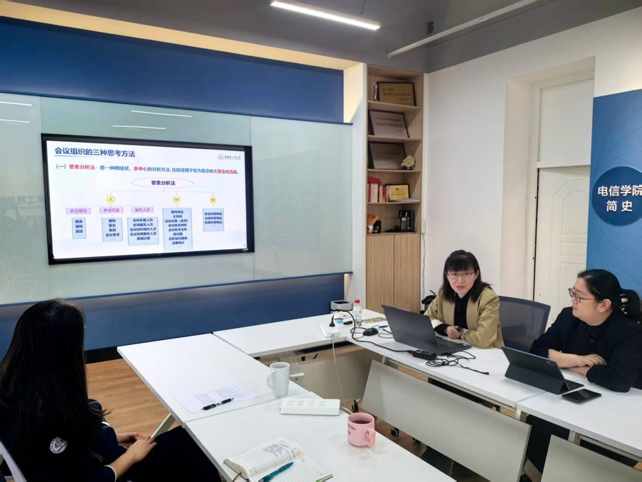 为进一步推动深入贯彻中央八项规定精神学习教育走深走实,打造 “学习型、研究型、服务型、精干高效” 管理队伍,电信学院组织开展机关管理人员能力素质提升系列培训,11月12日进行了第四期“如何做好会务和公务接待工作”专题培训,培训由机关综合办公室主任张琦琦主持,机关全体人员参加学习。