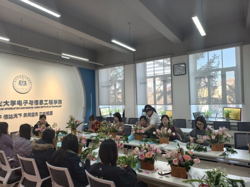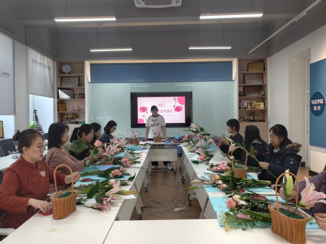 为庆祝“三八”国际劳动妇女节,表达对女教职工的敬意和关怀,电信学院于3月9日上午开展了插花艺术活动,近20位老师参加活动。