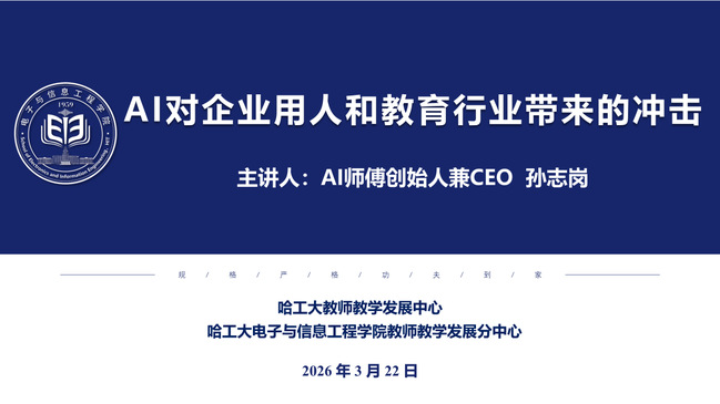 3月22日,电子与信息工程学院教师教学发展分中心举办“AI对企业用人与教育行业的冲击”专题讲座。AI师傅创始人兼CEO孙志岗应邀主讲,来自我校一校三区及省内外十余所高校[1] 的千余名教师通过腾讯会议及哈工大教师教学发展中心直播号线上参会。学院院长彭宇教授致辞,副院长李杨教授主持讲座。